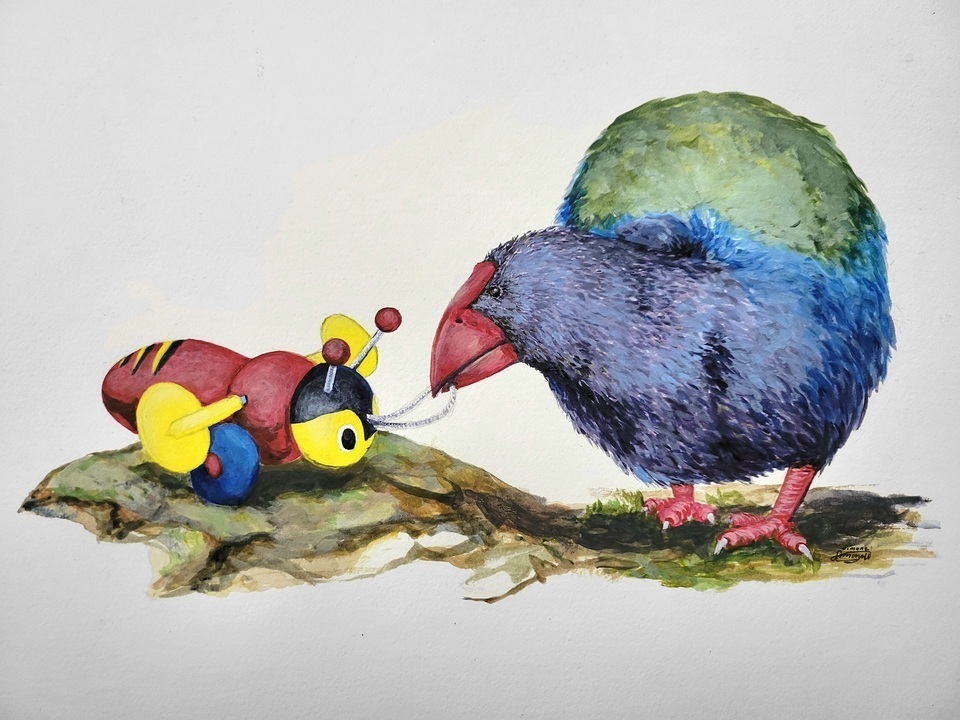 This collection of original artwork is inspired by the interactions between people and nature. Specifically looking at the current state of native fauna in NZ, with human objects included to create playful metaphors. This concept started in Fiordland National Park when I began work as a hut ranger on the great walks. Living and working in the protected native forest, experiencing the successes and struggles of the creatures we are trying to preserve, formed the foundation for these art works.