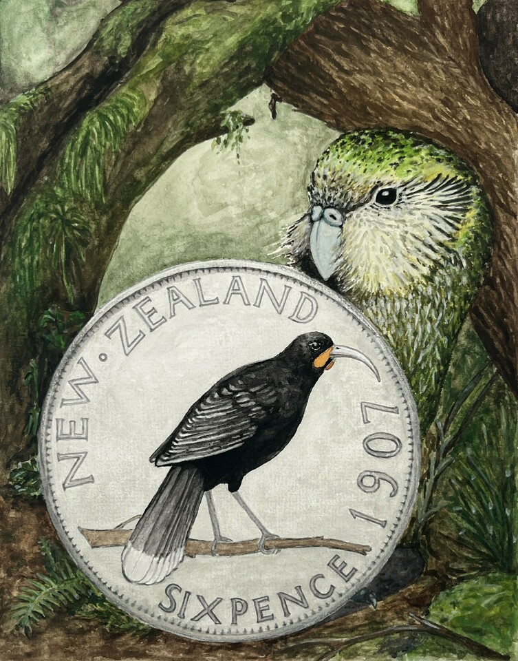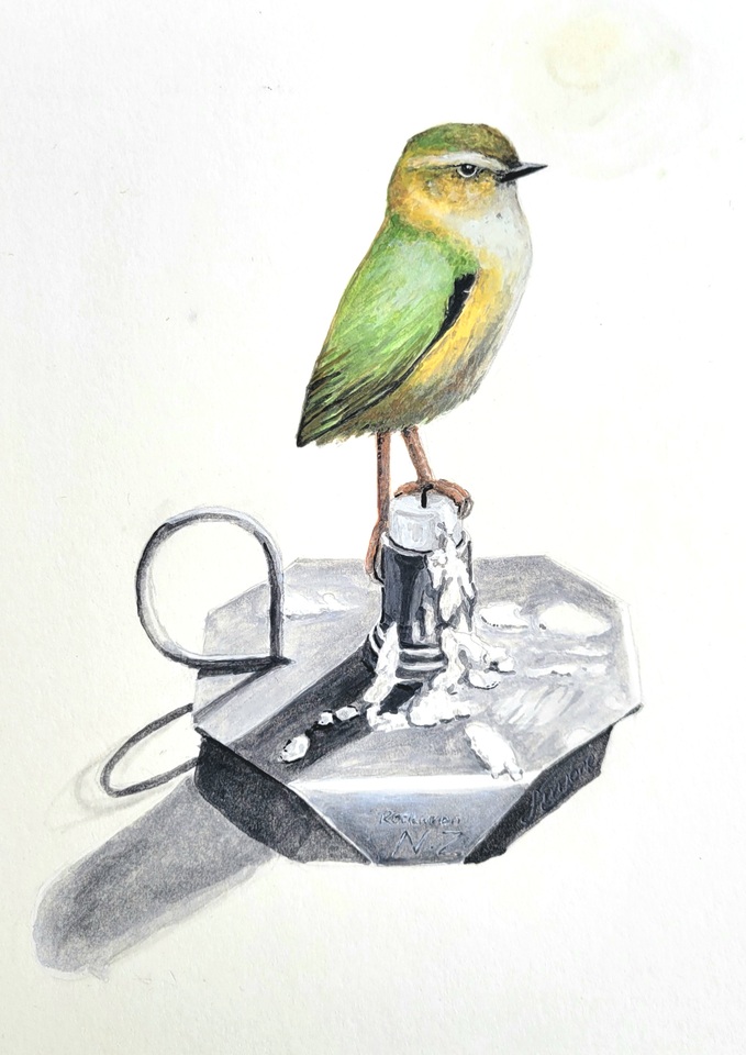 This collection of original artwork is inspired by the interactions between people and nature. Specifically looking at the current state of native fauna in NZ, with human objects included to create playful metaphors. This concept started in Fiordland National Park when I began work as a hut ranger on the great walks. Living and working in the protected native forest, experiencing the successes and struggles of the creatures we are trying to preserve, formed the foundation for these art works.